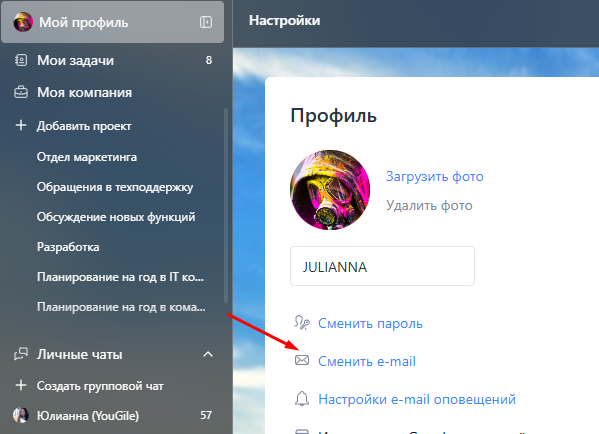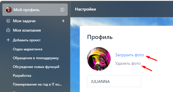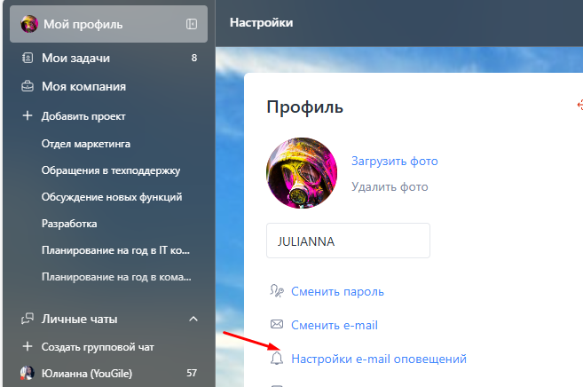 В разделе "Мой профиль" в веб-версии (в браузере) и в десктоп-приложении доступны следующие настройки: