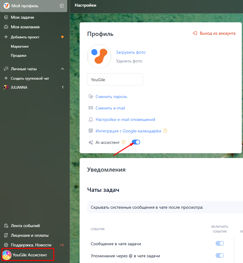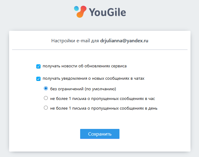 Через кнопку "Настройки e-mail оповещений" можно включить/отключить отправку на почту уведомлений о новых сообщениях в чатах, а также новостей об обновлениях сервиса YouGile.