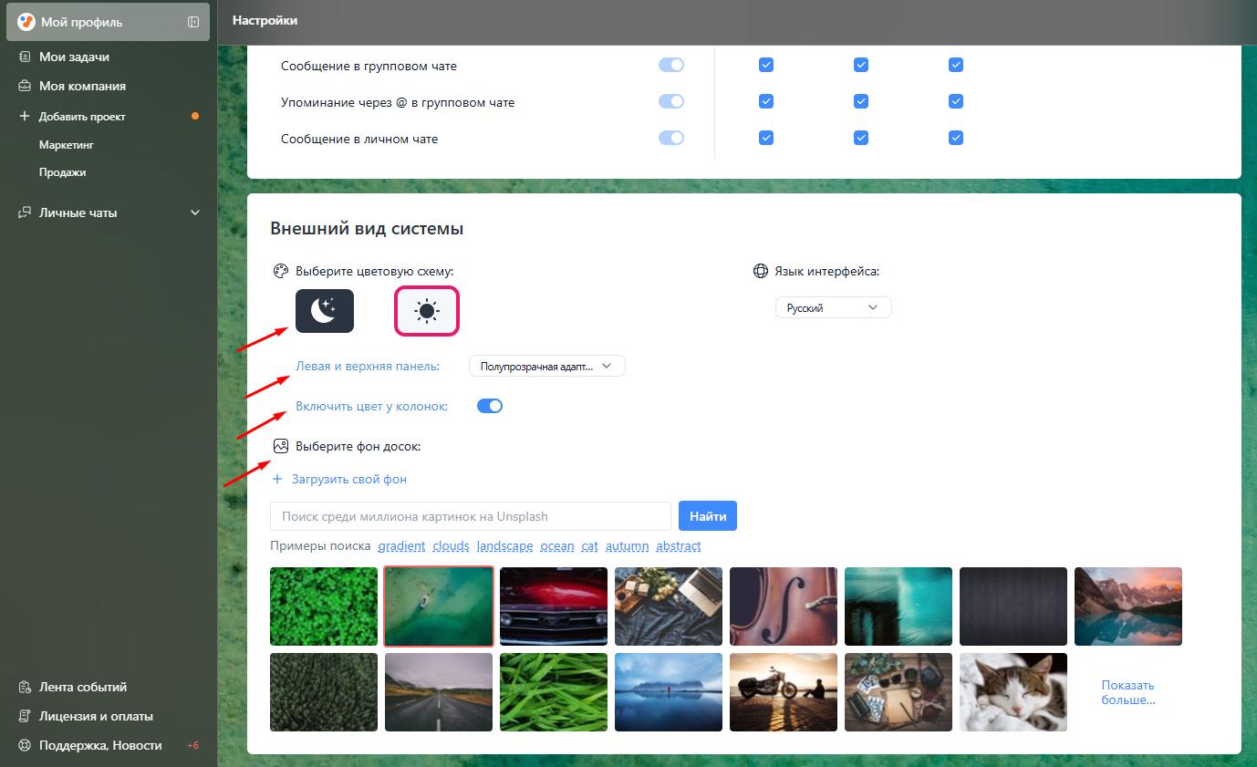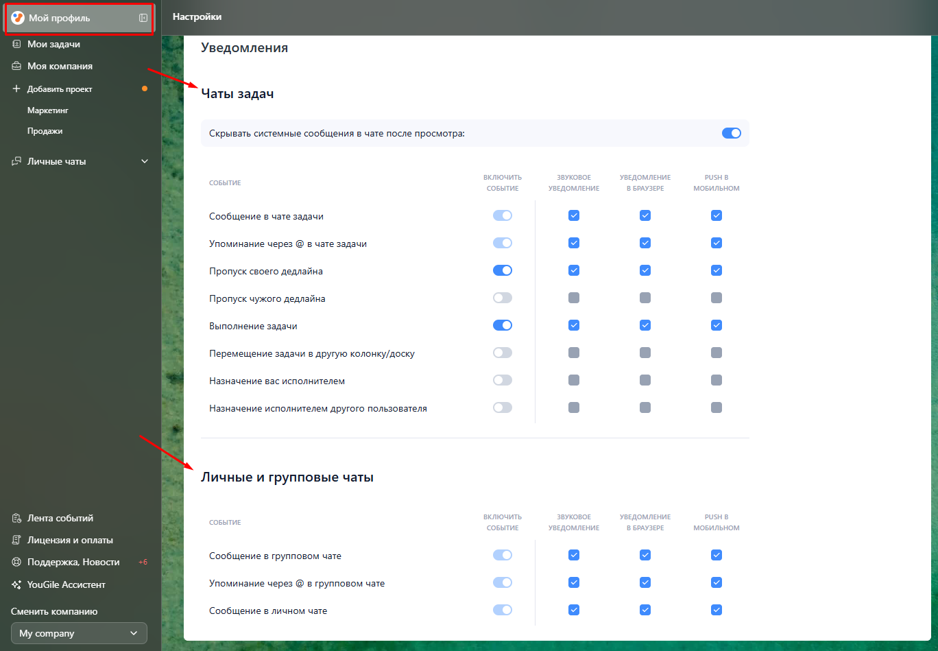 Каждый пользователь может настроить, по каким событиям он будет получать уведомления в чатах задач, а также в личных и групповых чатах. Подробнее про настройки уведомлений в статье Как настроить уведомления?