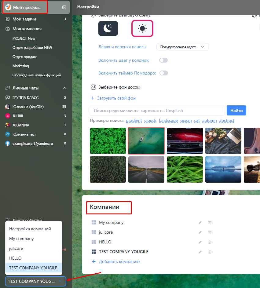 Например, у вас есть рабочая компания, где состоите вы и ваши коллеги. Можно создать свою компанию через кнопку "Добавить компанию" для ведения личных дел, после этого можно будет переключаться между компаниями через меню в нижнем левом углу. Ваша личная компания будет видна только вам.