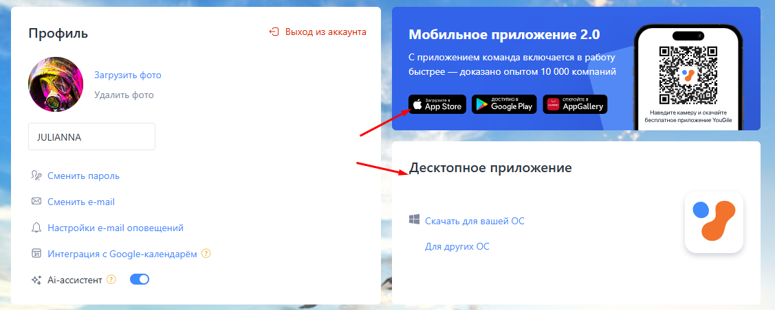 Также ссылки на приложения есть на сайте https://ru.yougile.com/download.