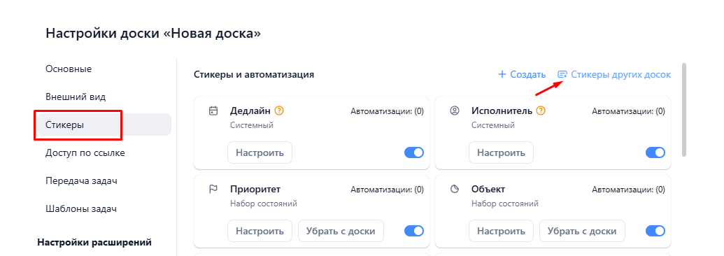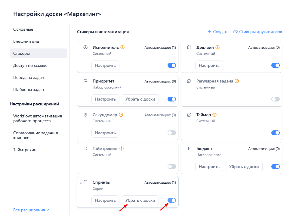 Стикер можно убрать с доски через переключатель или кнопку "Убрать с доски" в разделе "Стикеры".