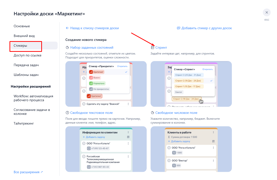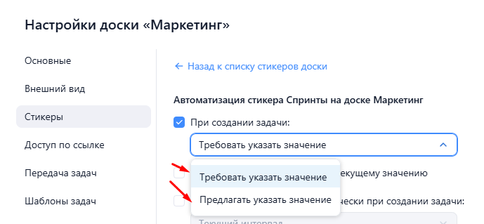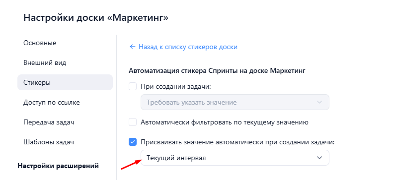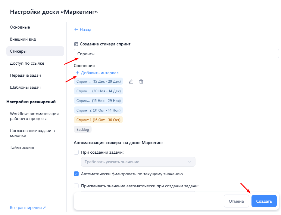 3) Также можно настроить, чтобы при создании задачи ей присваивался один из интервалов стикера Спринт.