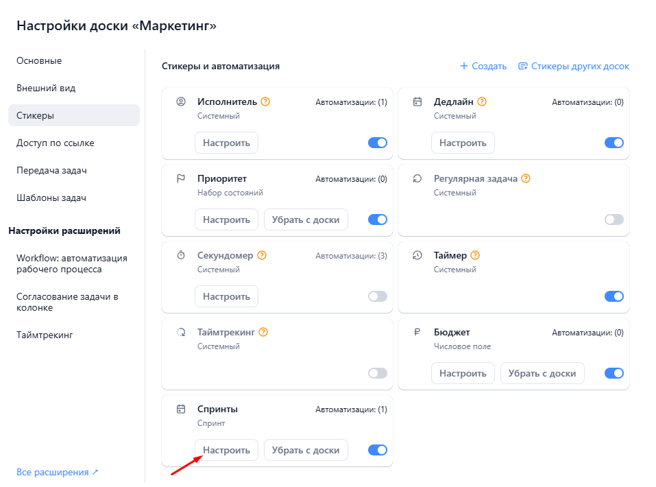 В разделе "Стикеры" есть возможность настроить автоматизации для стикера Спринт.