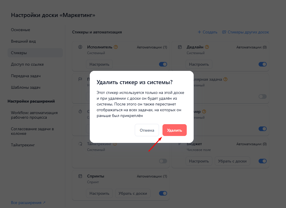 Если стикер находится только на текущей доске (а на других досках компании его нет), откроется окно с предложением полностью удалить стикер из системы.