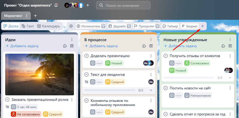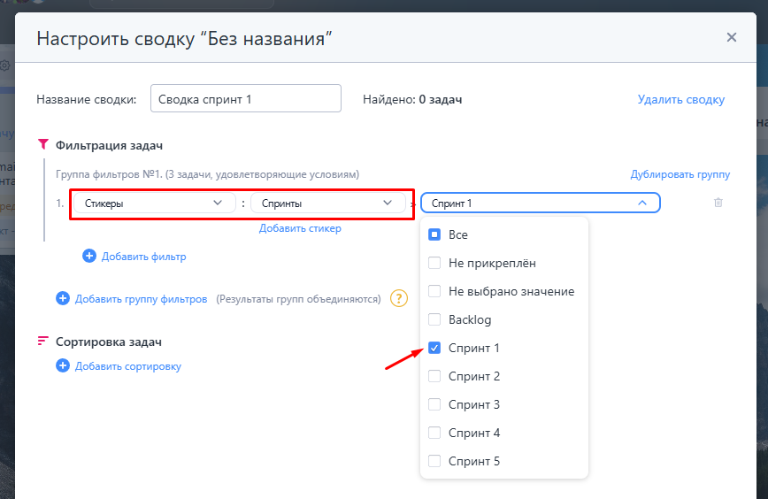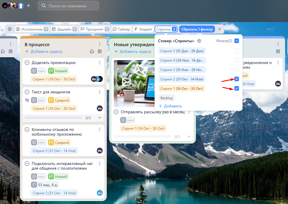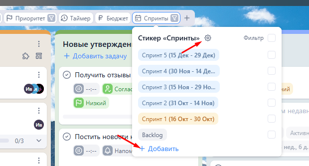 После того, как стикер Спринт будет добавлен к задачам на доске, вы сможете фильтровать задачи по одному или нескольким выбранным признакам.