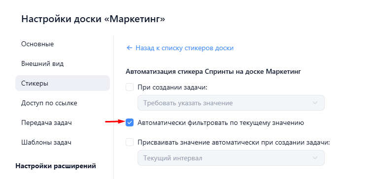 По умолчанию при создании стикера она включена. В этом случае задачи на доске фильтруются у всех пользователей по текущему спринту.