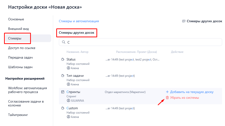 Удаление стикеров из компании также доступно из раздела "Стикеры" - "Стикеры других досок"