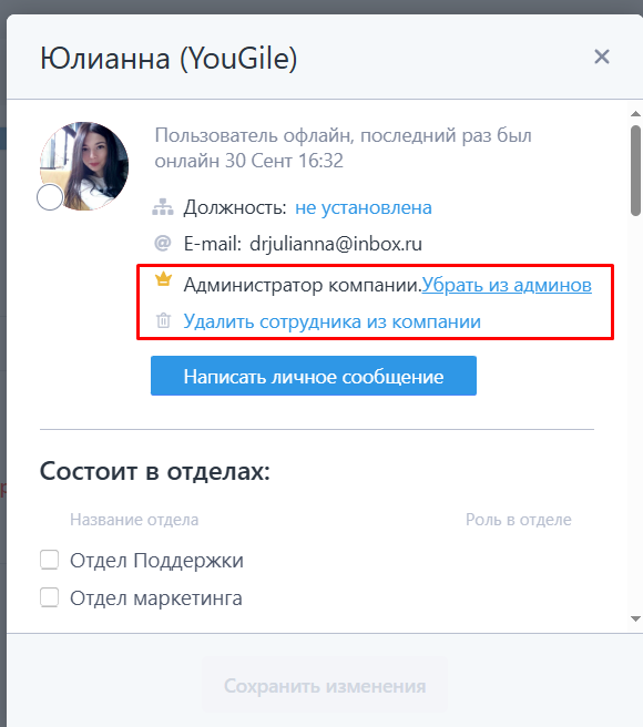 Один администратор имеет право удалить другого администратора из компании, а также убрать из админов.