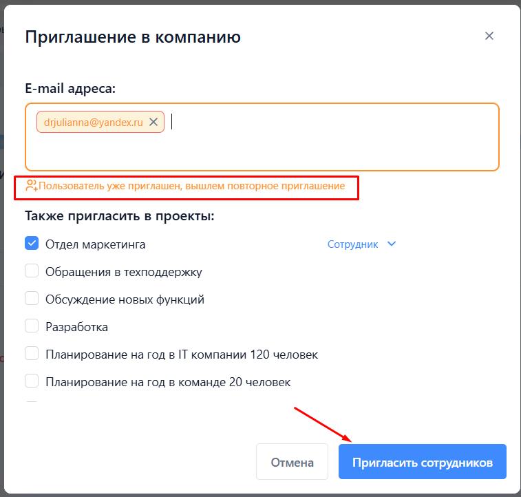 Система уведомит, что пользователь уже приглашен, нужно будет нажать на "Пригласить сотрудников".