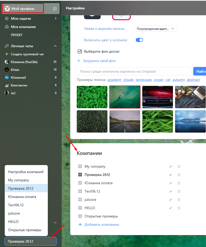 Если у пользователя уже есть регистрация в YouGile, он будет сразу же добавлен в компанию, т.е. в этом случае переходить по ссылке из письма необязательно. Посмотреть список компаний можно из настроек профиля, в блоке "Компании", а также из меню в нижнем левом углу.