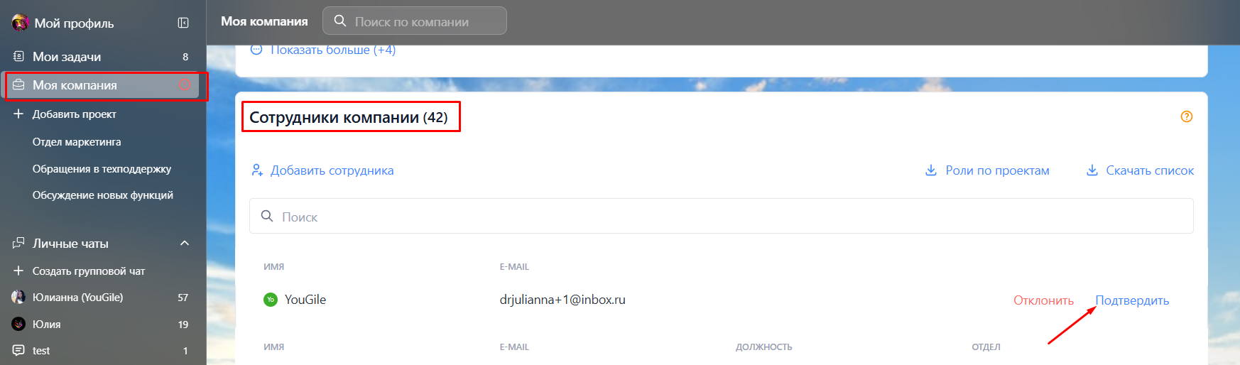 В свою очередь администратор должен подтвердить запрос в разделе "Моя компания":