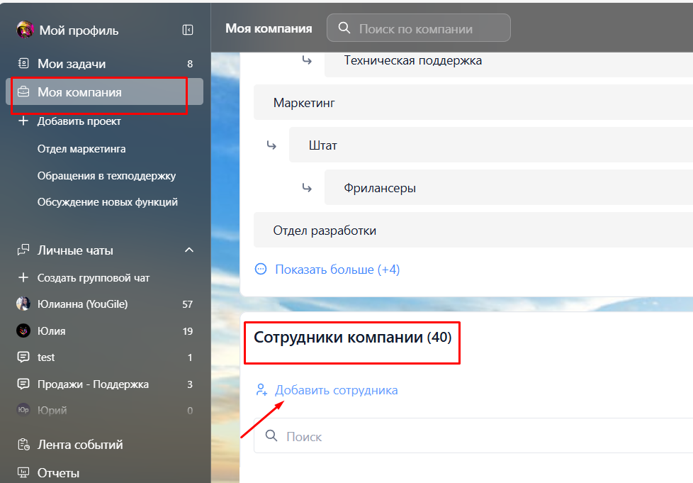 Второй вариант: в блоке "Сотрудники компании" нажать на "Добавить сотрудника".