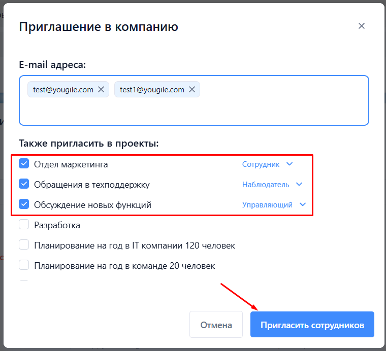Здесь можно выбрать, в какие проекты будут приглашены пользователи, установить им роли.