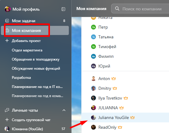 (о настройках отделов здесь: Отделы компании) - Пользователям с ролью Управляющий в проекте