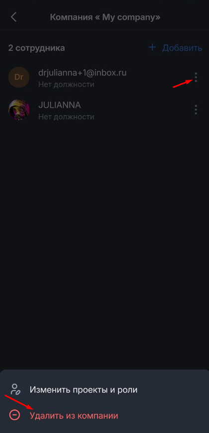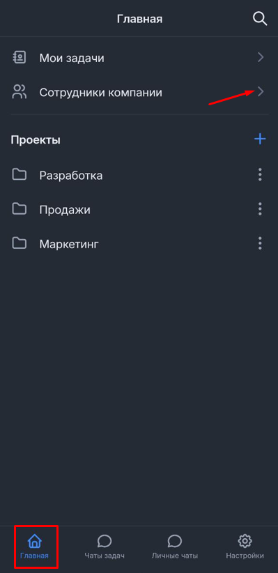 В мобильном приложении пригласить пользователей в компанию и добавить их в проекты можно из раздела "Главная". Нужно перейти в "Сотрудники компании" и нажать на "Добавить".