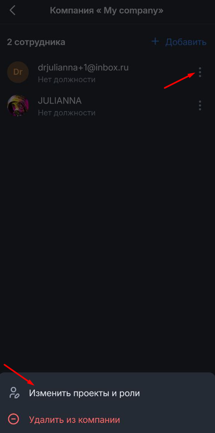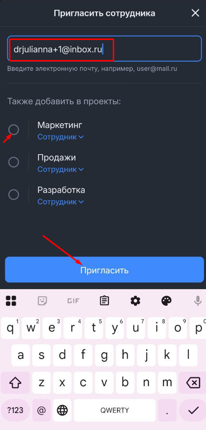 Нужно ввести e-mail пользователя и нажать на "Пригласить". Можно сразу же выбрать, в какие проекты с какой ролью пользователь будет добавлен. По умолчанию в мобильном приложении можно выбрать только встроенные роли: Управляющий, Сотрудник и Наблюдатель.