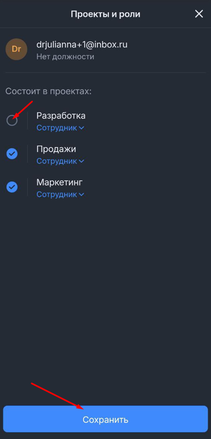 Для удаления из определенных проектов - нужно нажать на "Изменить проекты и роли", убрать галочки напротив проектов, нажать на "Сохранить".