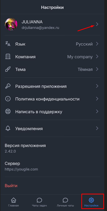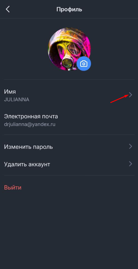 В разделе "Настройки" нужно нажать напротив своего имени, откроется "Профиль".